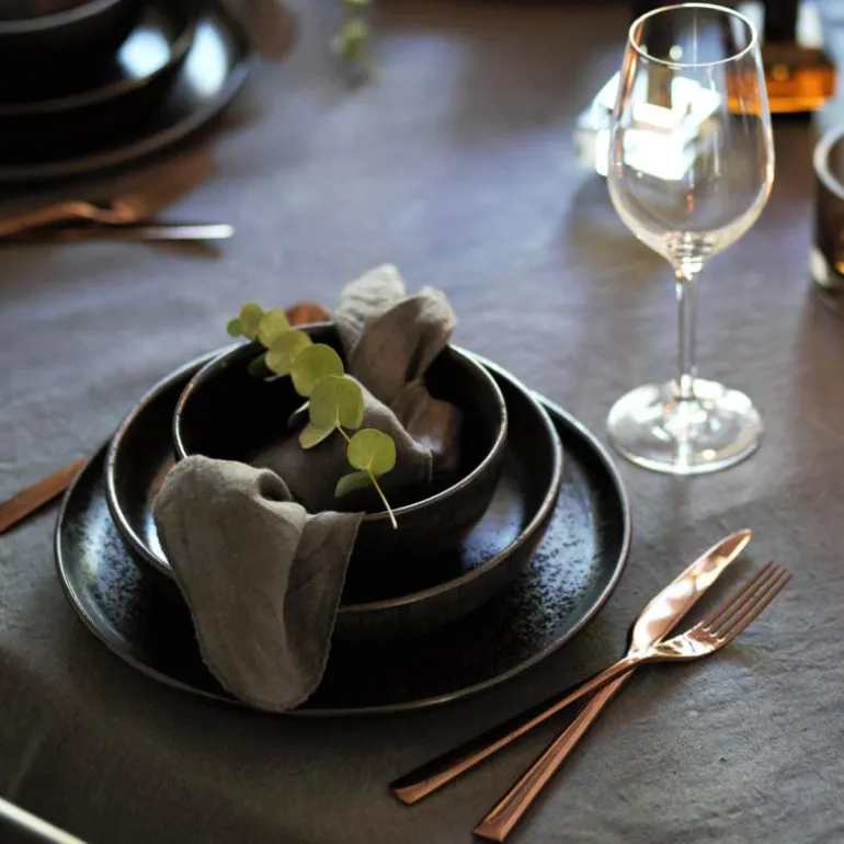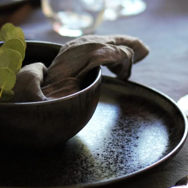 Rustikt servise med en flott reaktiv glasur. Ingen produkter blir helt like med denne type glasur. Lager et levende, hyggelig aktivt bord. Fargene spiller i sort, grått og over i noe varmere mørk brun.