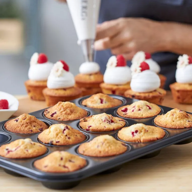 Muffinsform 12 stk 27x36x3 cm stål, fra Blomsterbergs. Muffinsform med 12 rom/hull, laget i stål med nonstick belegg som slipper lett og er enkelt å rengjøre. Hvert hull, dia. 7,1 cm, rommer 0,08 liter, og formen brukes til å steke alle typer muffins, porsjonskaker og boller. Du kan også bruke formen i det salte kjøkken til små, stekte potettopper, små eggekaker og lignende.
