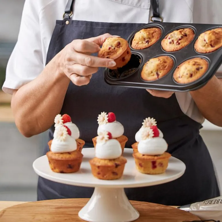 Muffinsform 6 stk 27×18,5×3 cm stål, fra Blomsterbergs. Muffinsform med 6 rom/hull, laget i stål med nonstick belegg som slipper lett og er enkelt å rengjøre. Hvert hull, dia. 7,1 cm, rommer 0,08 liter, og formen brukes til å steke alle typer muffins, porsjonskaker og boller. Du kan også bruke formen i det salte kjøkken til små, stekte potettopper, små eggekaker og lignende.