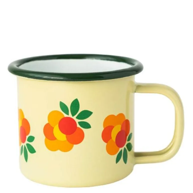 Nydelig emaljekopp med bærmotiv. Bruk den hjemme eller på tur – for eksempel er den fin til bærplukk i skogen. Plukkeputling i skogen og seriøst mye smaking underveis, det er nok den fineste formen for bærtur, i alle fall for de små. Derfor er vi tilhengere av den. Knallblå tunge, lilla fingertupper. Egenplukket syltetøy er nok det aller beste syltetøyet, en søt gave fra naturen til oss, tusen takk til den. Det er egentlig ikke mengden det kommer an på. Å fylle en liten emaljekopp med bær, for eksempel, det kan fort bli nok syltetøy til en hel, deilig brunostskive, det. Nyt turen og husk å ta lange kakaopauser!