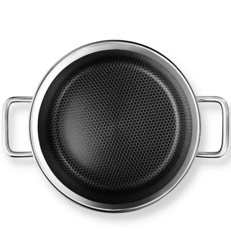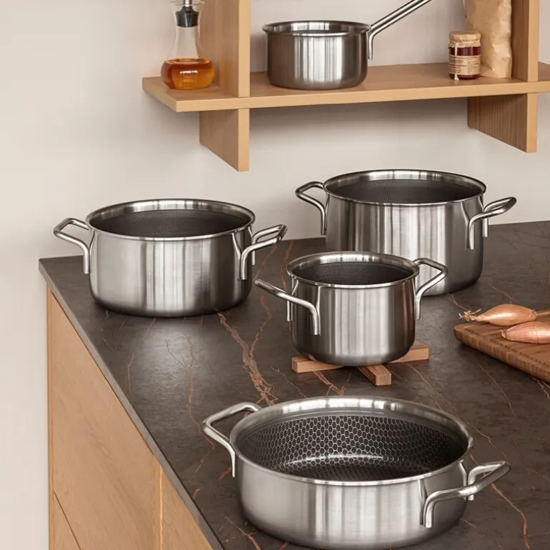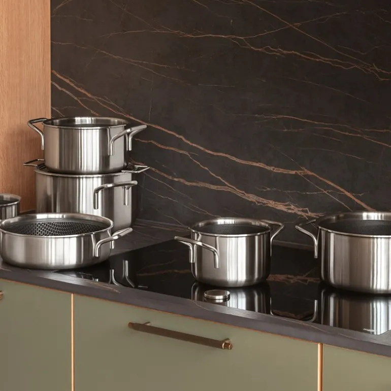 Hoveddelen av gryten er laget av bærekraftige materialer, med opptil 90 prosent resirkulert rustfritt stål og 100 prosent resirkulert aluminium. Multi-layer 3-lagskonstruksjonen gir optimal varmefordeling og rask oppvarming, mens den harde yttersiden beskytter mot slitasje og gir gryten lang levetid.