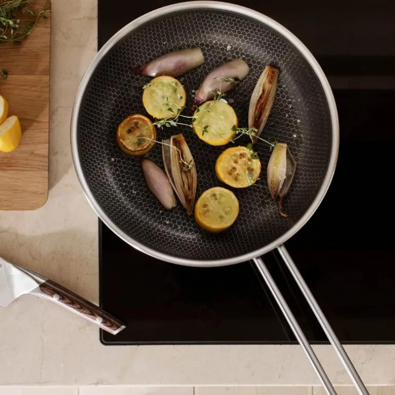 Det slitesterke Slip-Let®-belegget reduserer behovet for stekefett, gir en jevn stekeskorpe og gjør rengjøringen enkel. Stekepannen er utstyrt med trelagsteknologi som gir optimal varmefordeling, slik at maten tilberedes jevnt og raskt. Den robuste yttersiden tåler daglig bruk og utfordrende oppgaver på kjøkkenet.
