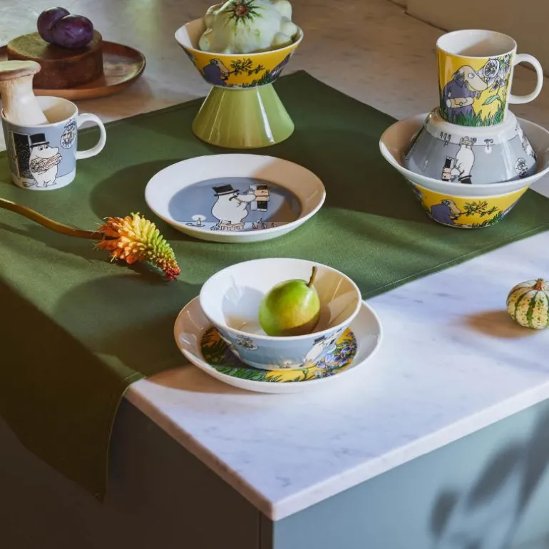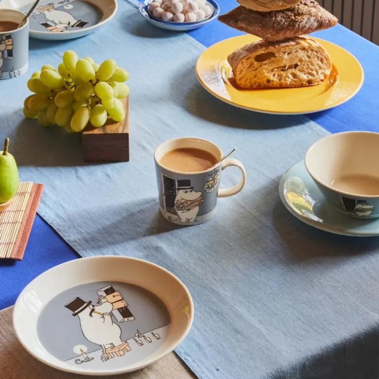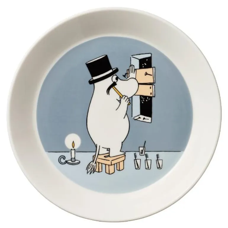 Mummi asjett 19cm Mummipappa grå. Mummipappa klargjør huset for vinteren, slik at familien holder seg varm under vinterdvalen. Vinduene isoleres med planker og vedlageret fylles opp. Det gjør at kulden stenges ute og varmen holder seg i huset.