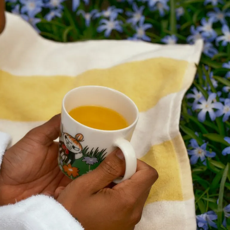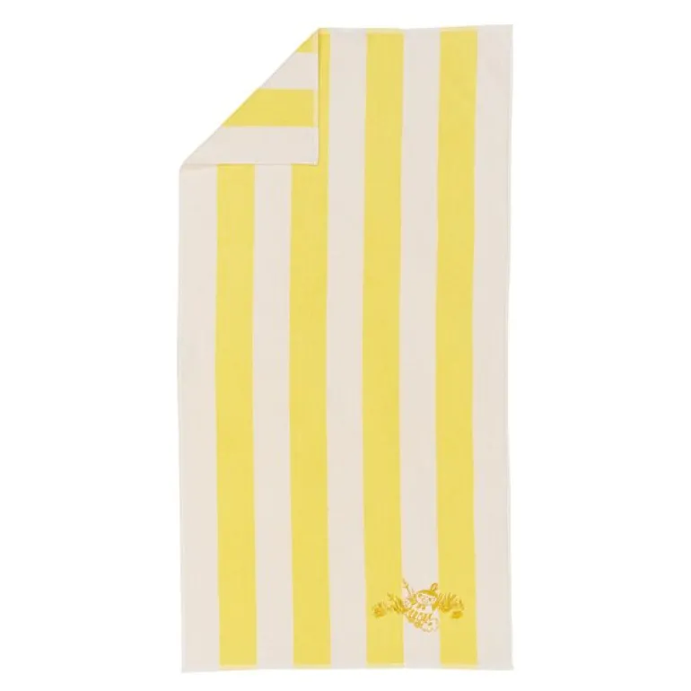 Mummi badehåndkle 70×140 Lille My fra MoominArabia. Pakk deg inn i et mykt og koselig Mummi badehåndkle. Modige Lille My ser forundret opp på den nye store stjernen – en komet som er på vei mot Mummidalen. Hun er slett ikke bekymret for kometen som nærmer seg. I stedet ligger hun på enga og ser fascinert på den. Mummi badehåndkle 70×140 Lille My gul stripete, økologisk bomull.