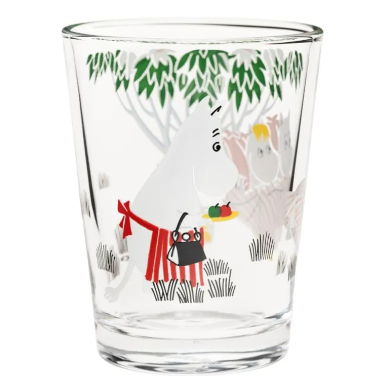 Opplev magien av Mummidalen med dette vakre drikkeglasset 22 cl, Hvilestund, fra MoominArabia. La deg inspirere av den avslappede atmosfæren når Mummifamilien hviler i hagen på en varm sommerdag. Mummitrollet, Snorkfrøken, og Mummipappa nyter øyeblikk av ro og harmoni, og solen går sakte ned uten bekymringer for morgendagen.