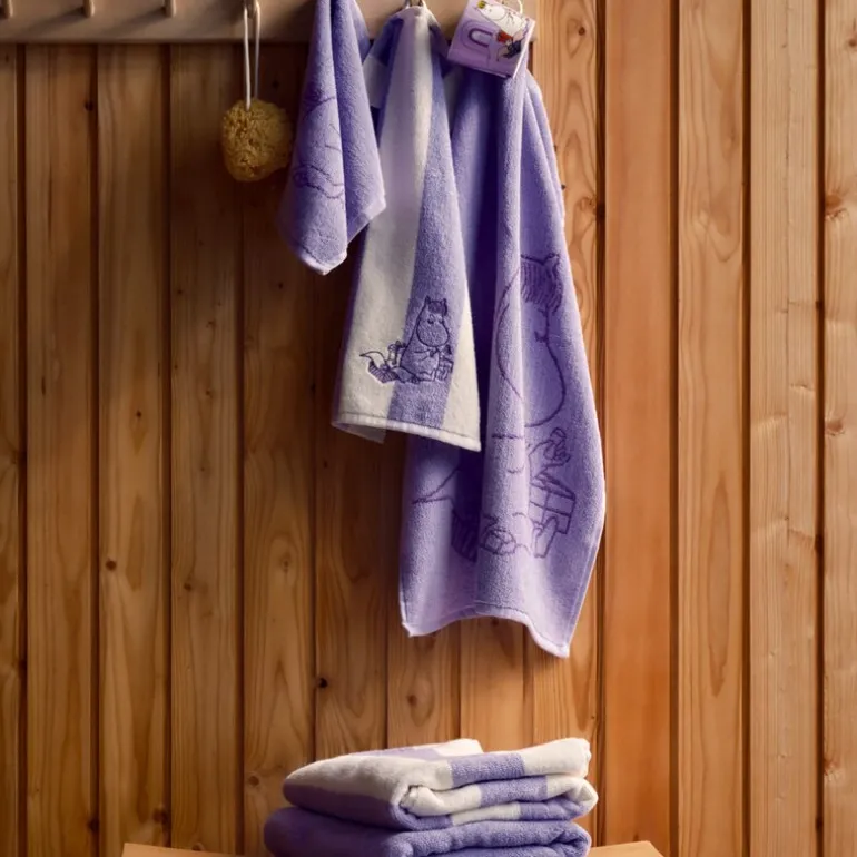 Mummi håndkle 30×50 Snorkfrøken lilla fra MoominArabia. Et mykt og koselig Mummi håndkle. Snorkfrøken reiser til den franske rivieraen. Der kjøper hun nye klær og mingler med kjendiser. Men etter en stund blekner glansen av hennes nye eksistens og hun lengter tilbake til det enkle livet i Mummidalen. Mummi håndkle 30x50cm Snorkfrøken lilla stripet, økologisk bomull.