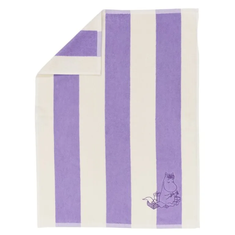 Mummi håndkle 50×70 Snorkfrøken lilla fra MoominArabia. Et mykt og koselig Mummi håndkle. Snorkfrøken reiser til den franske rivieraen. Der kjøper hun nye klær og mingler med kjendiser. Men etter en stund blekner glansen av hennes nye eksistens og hun lengter tilbake til det enkle livet i Mummidalen. Mummi håndkle 50×70 Snorkfrøken lilla stripet, økologisk bomull.