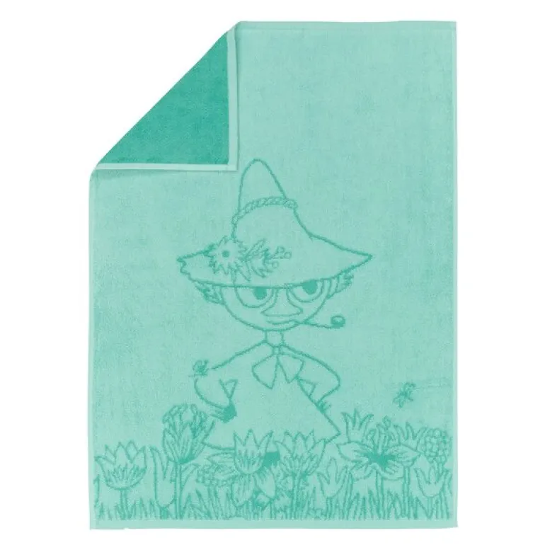MoominArabia Mummi håndkle 50×70 cm Snusmumriken mint gir en myk og koselig følelse til ditt daglige liv. Dette håndkleet er dekorert med illustrasjoner av Snusmumriken, som alltid gir kloke råd til sine venner. Historien om Mummitrollet, som får en gyllen hale og blir berømt, minner oss om at berømmelse kan ha sine ulemper. Snusmumriken advarer Mummitrollet om farene ved å være kjendis, og til slutt blir Mummitrollet lei av oppmerksomheten og klipper av de gylne halehårene. Laget av 100% økologisk bomull, er dette håndkleet både skånsomt mot huden og miljøvennlig. Gir en touch av Mummi-magi og visdom til ditt hjem, perfekt for alle som elsker Mummi-universet.