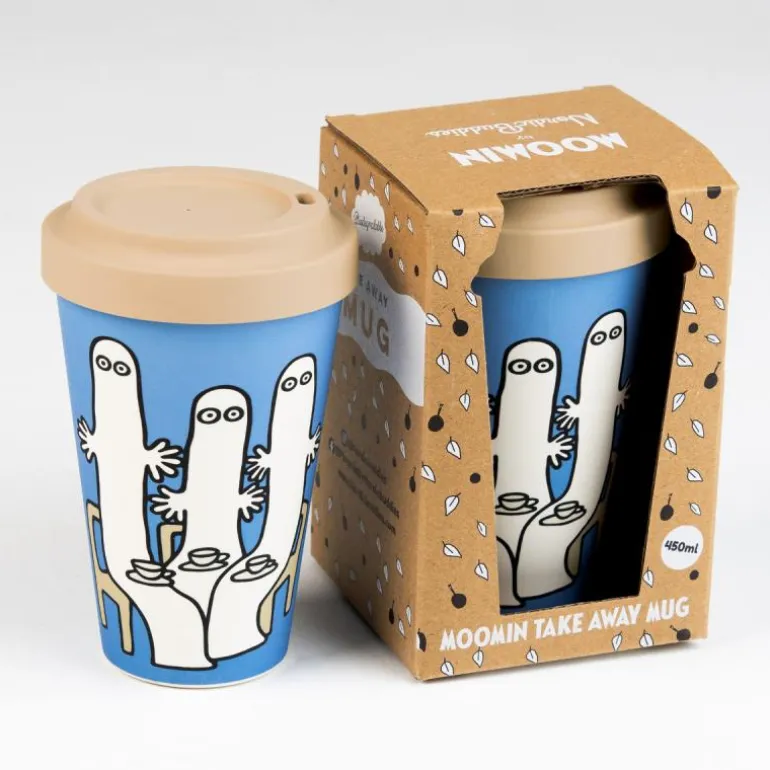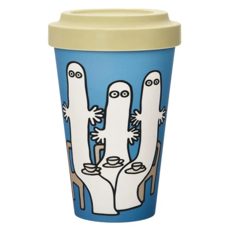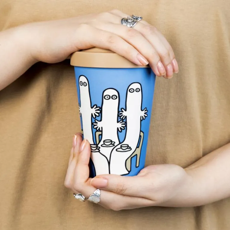 Praktisk og superkult take away-krus med illustrasjon av Hattifnattener som tar kaffepause. Kruset er laget av PLA (polylaktid), som er et fullstendig biologisk nedbrytbart og fornybart materiale. Det ser ut som plast, men inneholder ikke fossilbasert plast i det hele tatt. Lokket og «hylsen» på kruset er laget av silikon. Både materialet i koppen og pappen som brukes i emballasjen, er resirkulerbare. Volum: 450 ml. Pakken inneholder også en «hylse» til kruset som beskytter fingrene dine når du holder på varm drikke. Kruset og lokket kan vaskes i maskin. Krusene må ikke settes i mikrobølgeovnen.