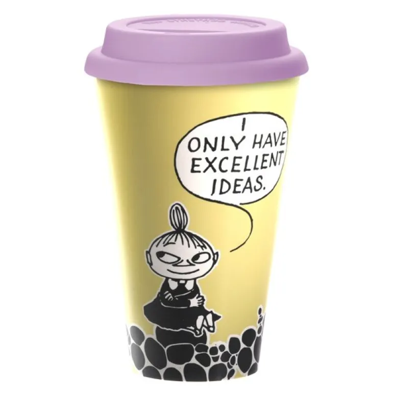 Praktisk gult Mummi krus til å ta med, med en illustrasjon av Lille My og et sitat: «Jeg har bare gode ideer». Dette kruset er laget av PLA (polylaktid), som er et fullstendig biologisk nedbrytbart og fornybart materiale. Det ser ut som plast, men inneholder ikke fossilbasert plast i det hele tatt. Lokket og «hylsen» på kruset er laget av silikon. Både materialet i koppen og pappen som brukes i emballasjen er resirkulerbare. Volum: 450 ml. Pakken inneholder også en «hylse» for kruset for å beskytte fingrene dine mens du holder en varm drikke. Kruset og lokket kan vaskes i maskin. Krusene må ikke plasseres i mikrobølgeovnen.