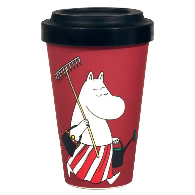Praktisk mørkerød Mummi take away-krus med en illustrasjon av Mummimamma som jobber i hagen.