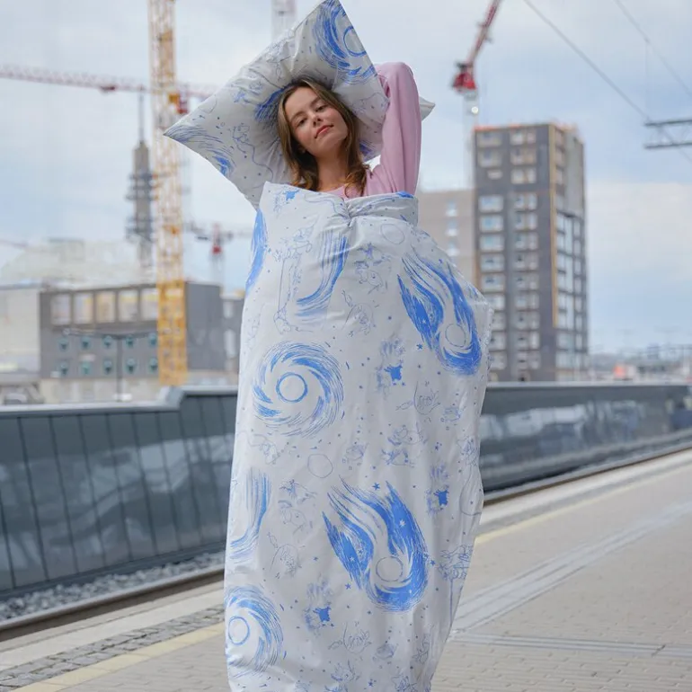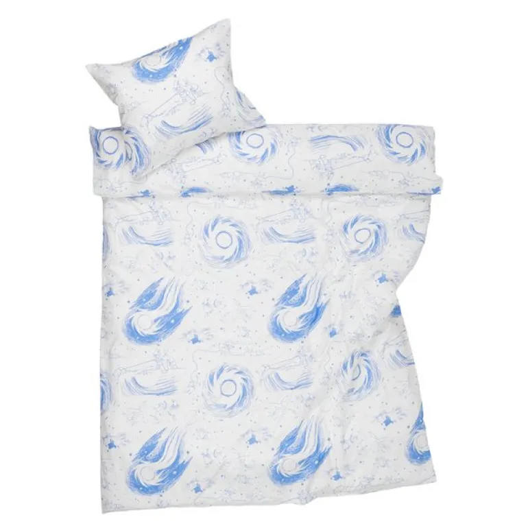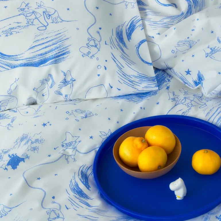 MoominArabia Mummi sengesett 140×200 cm komet inviterer deg til å drømme deg bort i en verden av spennende eventyr. Bli med Mummitrollet, Sniff og Snusmumrikken når de haster av sted for å advare de andre om kometen som nærmer seg Mummidalen. På deres reise møter de alle slags fascinerende oppdagelser mellom himmel, jord og hav. Dette sengesettet, produsert i myk og behagelig 100% økologisk bomull, gir en komfortabel soveopplevelse. MoominArabia sengesett komet bringer et snev av eventyr og magi inn i ditt soverom.