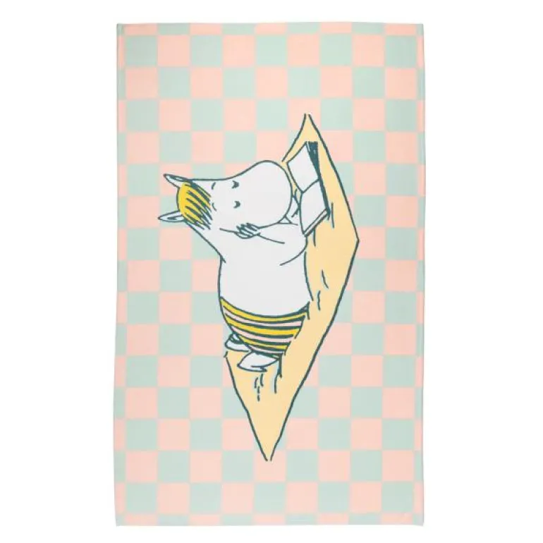 Mummi strandhåndkle 90×150 cm med motiv av Snorkfrøken, fra MoominArabia er det perfekte tilbehøret for Mummientusiasten! Dette håndkleet har et friskt uttrykk med et mønster av ruter og en beroligende turkis farge som gir assosiasjoner til havet. Snorkfrøken er oppslukt av en bok mens hun ligger på den varme sanden.