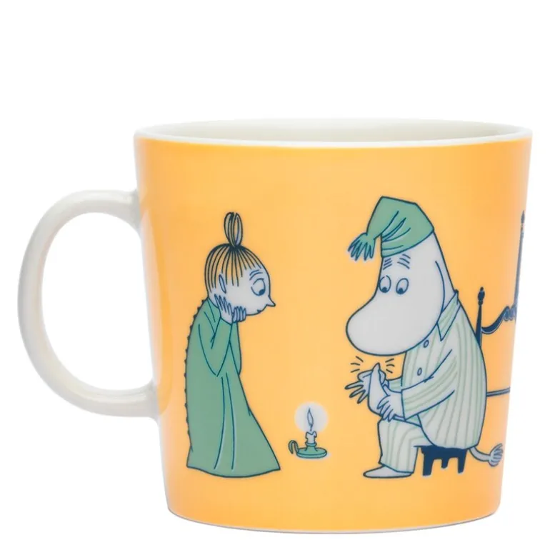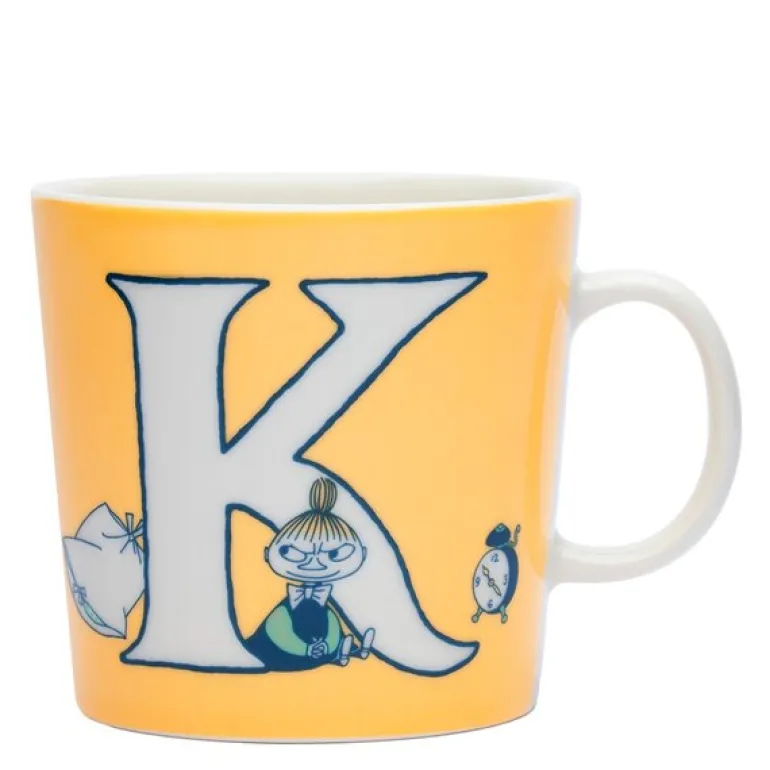 Gul mummikopp K 40 cl fra ABC-serien til MoominArabia. På K-koppen besøker Mymlen og barna Mummifamilien, og ungenes rampete oppførsel forårsaker problemer. Om kvelden sniker Lille My seg opp i sengen til Mummipappa og biter ham i tåa! Hun påstår at hun gjorde det fordi hun liker å bite. Illustrasjonene er basert på serien «Mummitrollet bygger hus».