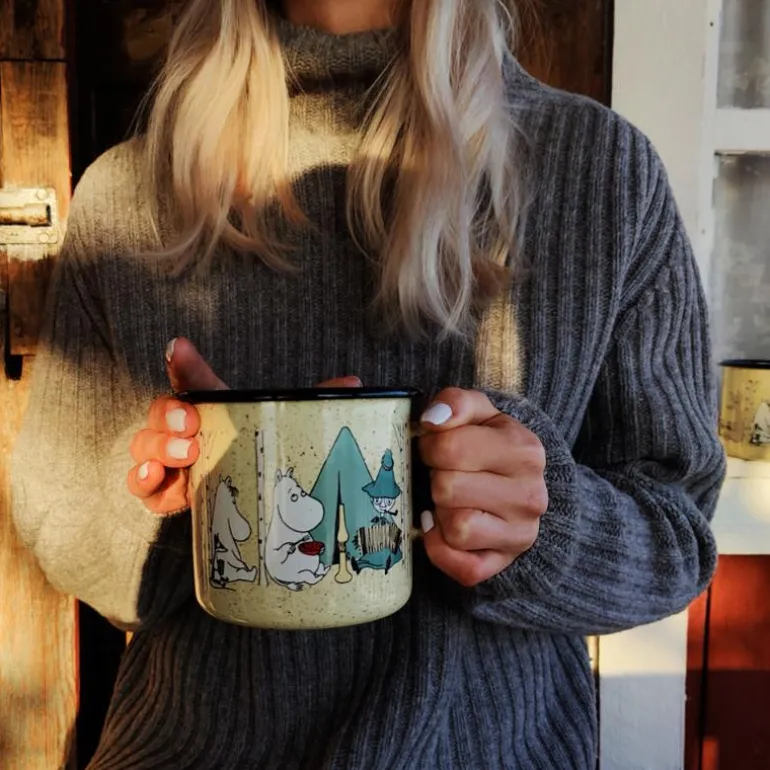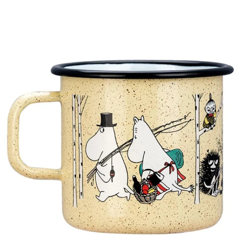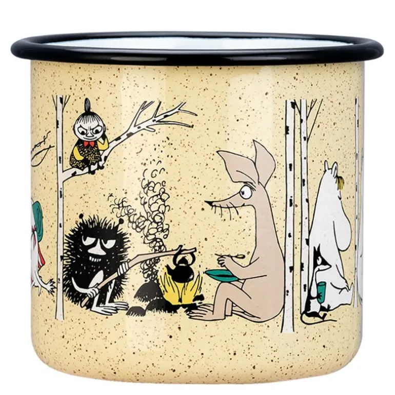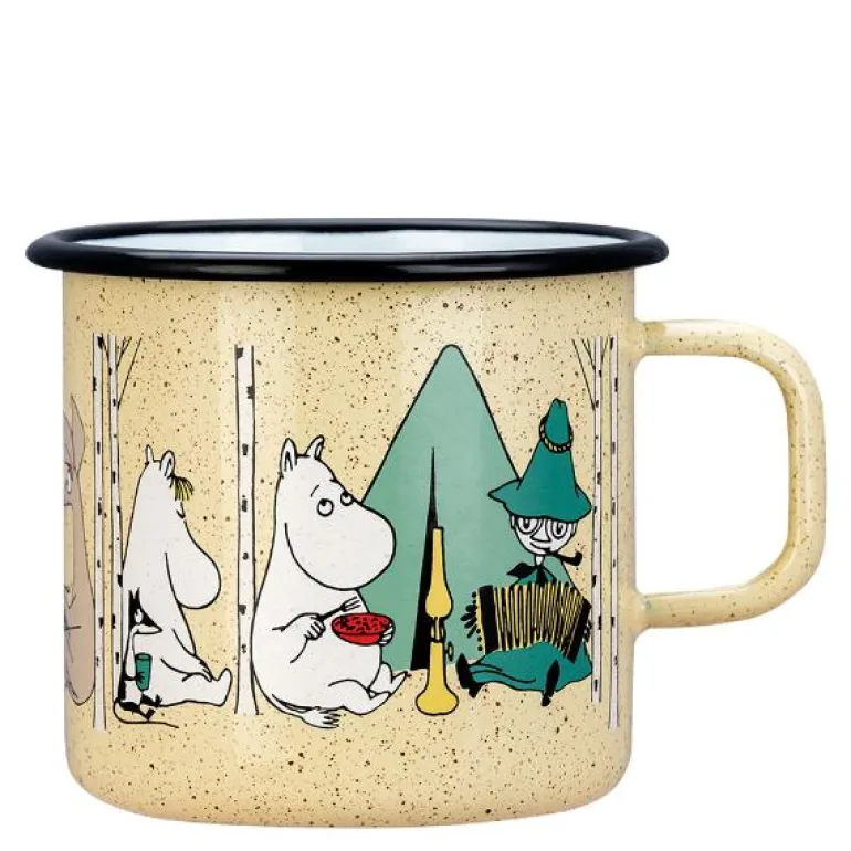 Eventyr venter! Og vennene dine fra Mummidalen kommer med, for jo flere, jo bedre eventyr. Telttur emaljekruset er illustrert med glade turgåere Little My, Snufkin, Sniff og Stinky.
