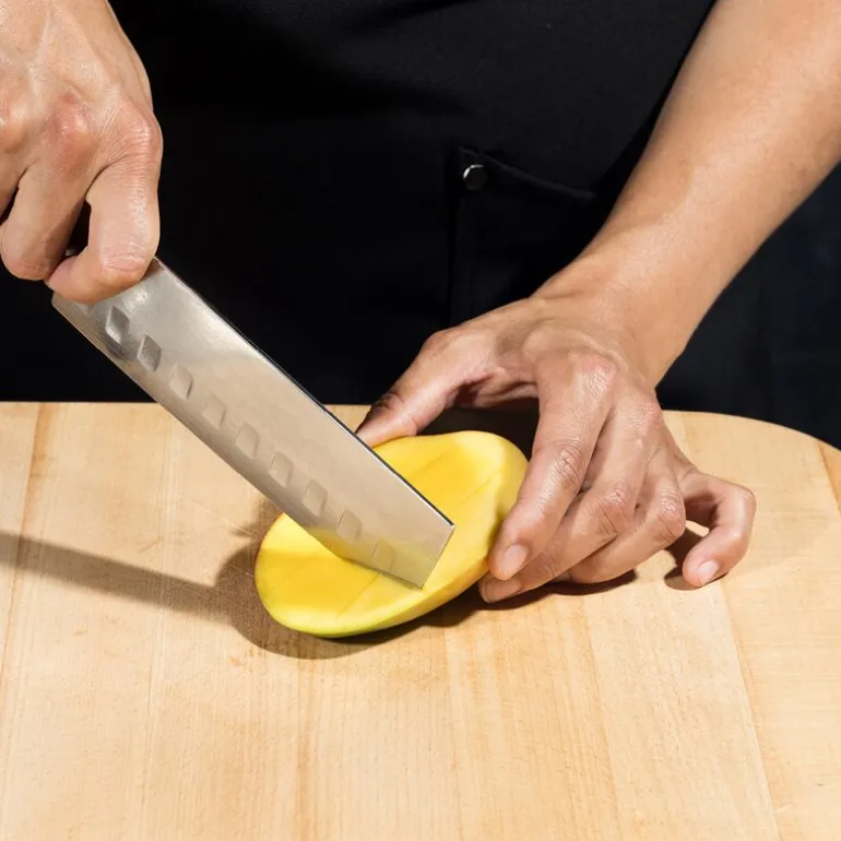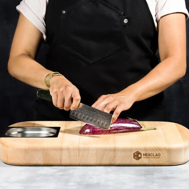 Hexclads Nakirikniv er en eksklusiv grønnsakskniv designet for presisjon og eleganse på kjøkkenet. Med et slankt, dobbeltslipt blad på 16 cm gjør denne kniven det enkelt å skjære gjennom grønnsaker med eksepsjonell nøyaktighet. Nakiri-knivens blad er langt og flatt med en stump tupp, som gir den et utseende som minner om en kjøttøks, men i en mindre og mer raffinert form tilpasset grønnsakskutting. Den flate delen av bladet sikrer optimal kontakt med skjærebrettet, noe som gir rene og jevne kutt hver gang. Den tynne profilen gjør den spesielt velegnet for skjæring av grønnsaker, men mindre egnet for bearbeiding av bein eller harde materialer.
