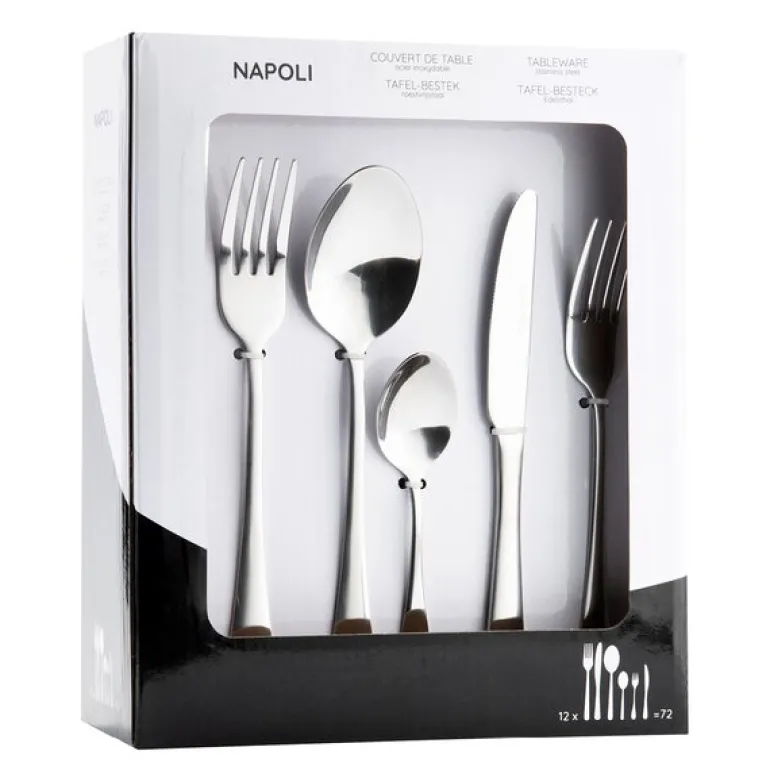 Napoli 72-deler fra Eternum er et stort og komplett bestikksett i rustfritt stål, perfekt til større husholdninger eller de som liker å invitere. I pakken får du 12 komplette sett med kniv, gaffel, matskje og teskje, i tillegg til 12 forrettskniver og 12 forrettsgafler.