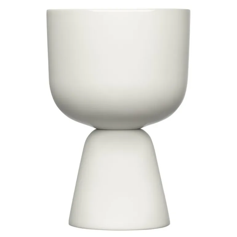 Nappula blomsterpotte 19×12,5 cm hvit fra Iittala. Nappula potteskjuler, designet av Matti Klenell, er nå tilgjengelig i en ny, liten størrelse. Den hvite potteskjuleren 190×125 mm er perfekt for urter, små grønne planter og sesongens blomster. Pottens stilige form gir ny inspirasjon til arrangement av grønne planter i hjemmet. Staselig alene eller i gruppe. En perfekt gave.