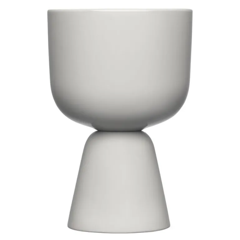 Nappula blomsterpotte 19×12,5 cm lysgrå fra Iittala. Nappula potteskjuler, designet av Matti Klenell, er nå tilgjengelig i en ny, liten størrelse. Den lysgrå potteskjuleren 190×125 mm er perfekt for urter, små grønne planter og sesongens blomster. Pottens stilige form gir ny inspirasjon til arrangement av grønne planter i hjemmet. Staselig alene eller i gruppe. En perfekt gave.
