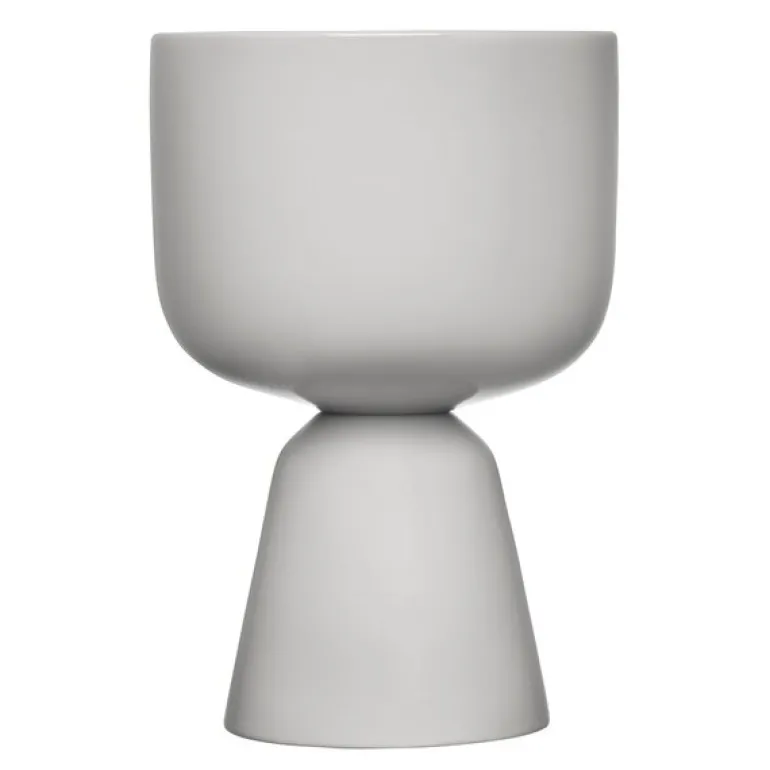 Nappula blomsterpotte 23×15,5 cm lysgrå fra Iittala. Designer Matti Klenell fikk ideen til Nappula-serien fra spesialformede bordben. Den lysegrå, mindre versjonen av Nappula-potteskjuleren fremhever skjønnheten til planter og blomster. Pottens stilige form gir ny inspirasjon til arrangementet av grønne planter i hjemmet ditt. Staselig alene eller i gruppe. En perfekt gave.
