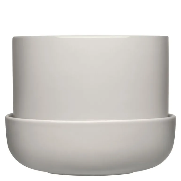 Nappula blomsterpotte med fat 17×13 cm lysgrå fra Iittala. Designer Matti Klenells Nappula-serie utvides med en lysegrå Nappula potteskjuler m/skål i størrelse 170×130 mm. Takket være designet er den allsidige potten egnet for mange forskjellige planter og blomster. Den lysegrå nyansen komplementerer den enkle formen og fremhever plantenes grønne omgivelser. En utmerket gaveidé for alle med grønne fingre.