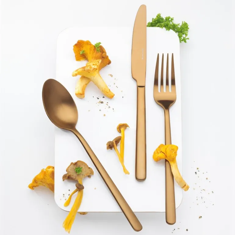 Den varme metalltonen gir bestikket et karakteristisk utseende som løfter enhver måltidsopplevelse. Settet kombinerer slitestyrke med et uttrykksfullt design og passer inn i både moderne og klassiske interiørstiler.