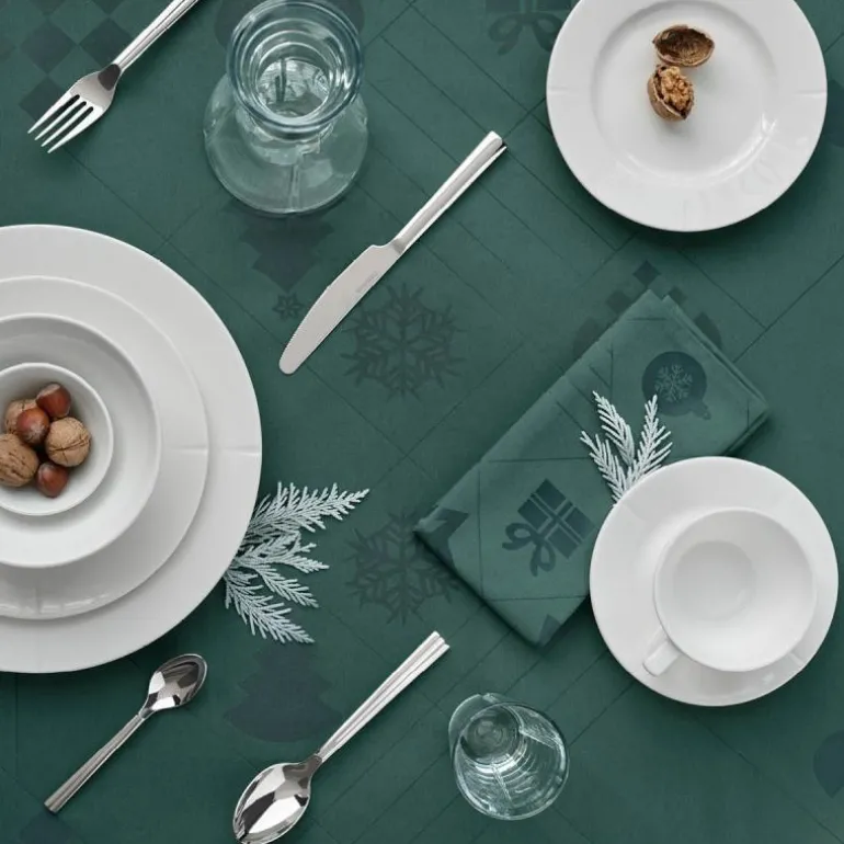 De fine, grønne jacquardvevde Natale-stoffserviettene er fantastiske til julens mange sammenkomster rundt julebordet. De måler 45 x 45 cm, og du får hele 4 stk. i én pakke. De kan være med på å sette prikken over i-en ved julebordet, og er et vakkert alternativ til alminnelige papirservietter. Selve designen til Natale-stoffserviettene er prydet med fine, små dekorative juledetaljer som gjør dem svært egnet på det årlige julebordet. De består av 55 % bomull og 45 % polyester og har dessuten en vann- og smussavvisende overflate. Du kan også vaske dem på 40 grader i vaskemaskinen og deretter henge dem til tørk. Stoffserviettene tåler ikke å tørkes i tørketrommel.