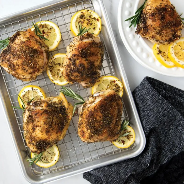 Quarter bakeplate med rist fra Nordic Wares serie Naturals. Bakeplaten i aluminium sprer varmen jevnt til matvaren og sørger for at alt bakes jevnt i ovnen. Bruk risten på platen for ekstra sprøhet eller separer dem for å ha både en bakeplate og avkjølingsrist. Perfekt for steking eller baking i ovnen. Risten fungerer også som en avkjølingsrist for bakverk.