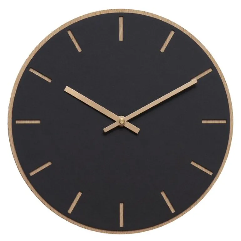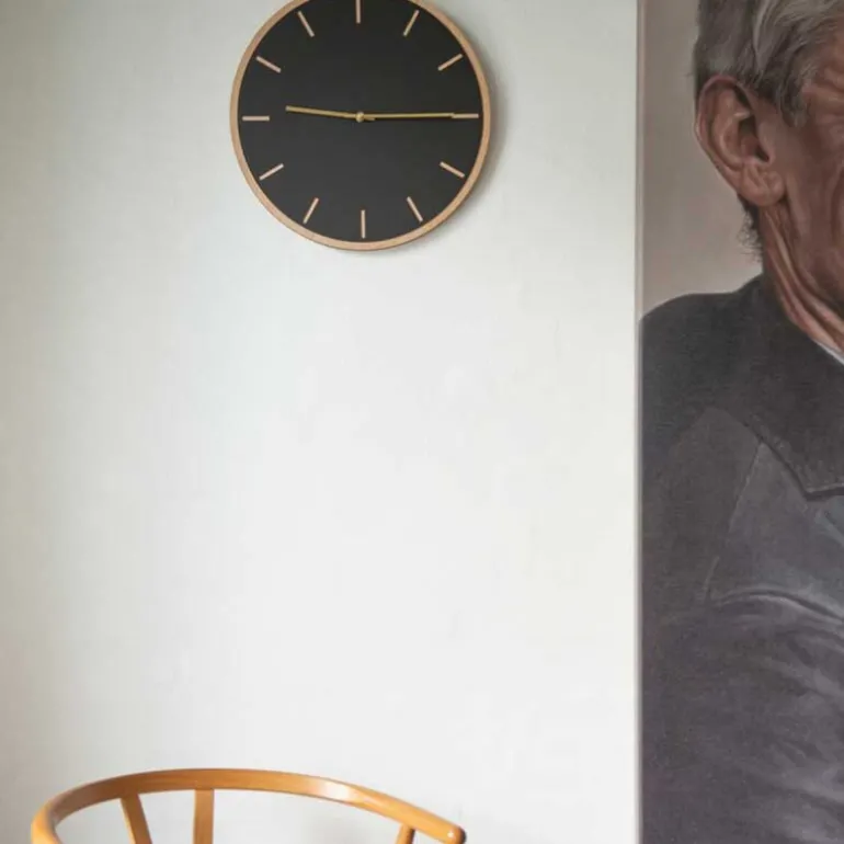 Denne stilrene Nero veggklokken fra Hemverk kombinerer dyp svart linoleum og varm eikefiner i en monokrom estetikk med et hint av glød. Den 28 cm store klokken har et minimalistisk uttrykk der de utskårne timeindikatorene tydelig står frem. Med kobbervisere får klokken en elegant glød som harmonerer med eikens varme toner og gir interiøret et løft. Ønsker du et eksklusivt, men nøytralt utseende på veggen, vil denne klokken være et perfekt valg, med mulighet for tilpasning med visere i sølv eller gull.