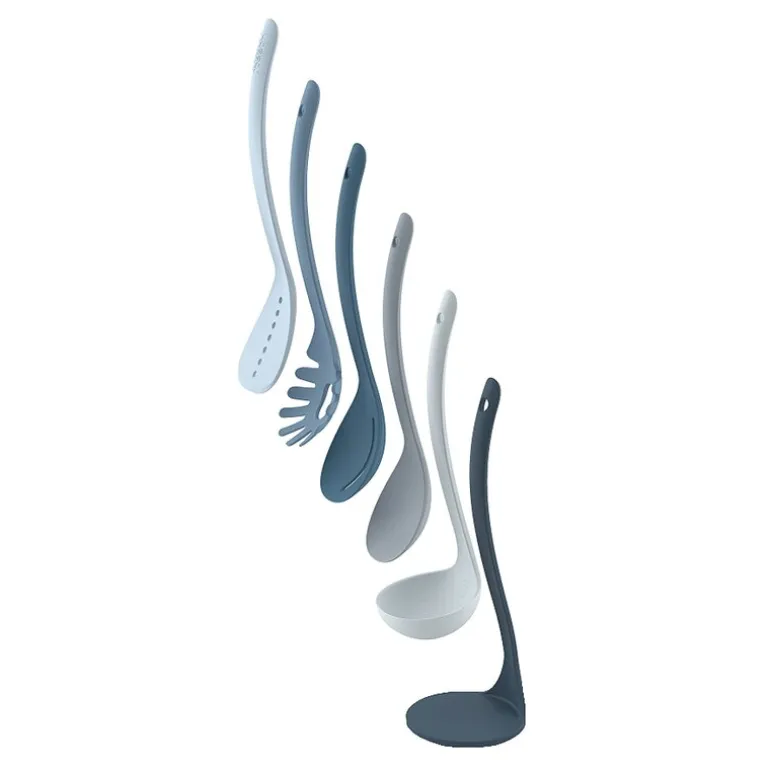 Praktisk redskapsett i 5 deler fra Joseph Joseph, som kommer med et smart stativ som holder redskapene samlet ved hjelp av magneter, noe som gir en dekorativ og funksjonell løsning på kjøkkenbenken. Settet inneholder fem essensielle kjøkkenredskaper: stekespade, spaghettiøse, øse, serveringsskje og hullsleiv.