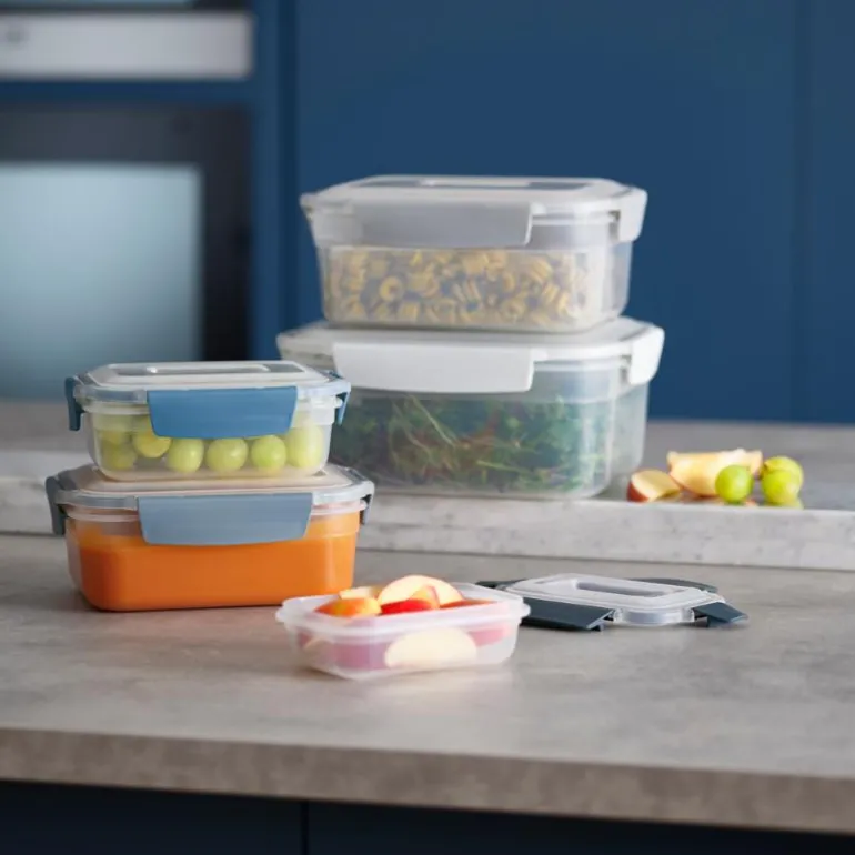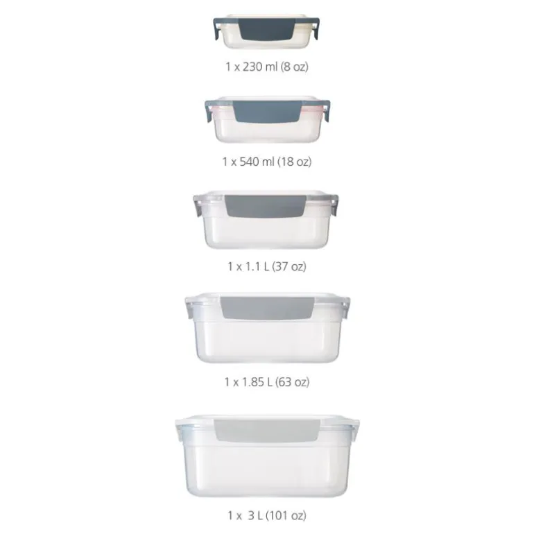 Oppbevaringssettet inneholder bokser i forskjellige størrelser, fra den kompakte 230 ml-boksen til den romslige 3 liters-boksen, slik at du kan lagre alt fra små porsjoner til større mengder mat. Uansett hva du trenger å oppbevare, har dette settet den rette størrelsen for deg.