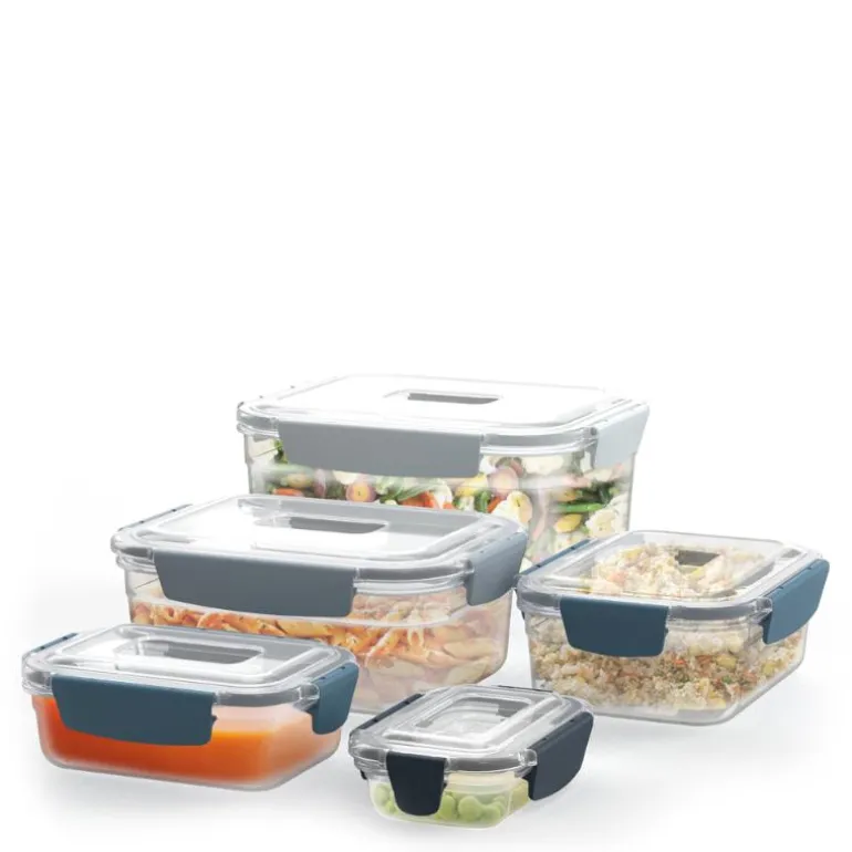 Joseph Joseph Nest Sky oppbevaringssett er det perfekte valget for å organisere og oppbevare maten din på en effektiv og plassbesparende måte. Dette settet består av fem bokser i ulike størrelser, alle med lekkasjesikre lokk og et smart klikklås-system som sikrer at lokkene sitter godt på plass og hindrer lekkasjer. Du kan være trygg på at maten din holder seg fersk i de lufttette boksene.