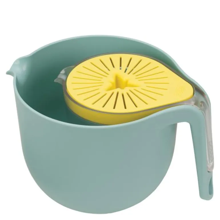 Nest trio målebeger m/sitruspresse fra Joseph Joseph. Dette praktiske settet kommer med en 2,5 liters målekanne, 0,5 liters målekanne og en sitruspresser, som alle kan stables pent sammen.