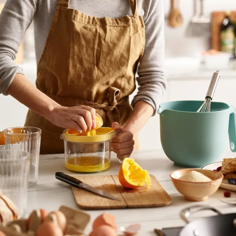 Settet har en praktisk og plassbesparende design, og kan rengjøres i oppvaskmaskinen. Målebegerne og sitruspresseren har en fargekombinasjon i multi-farger. Med denne allsidige løsningen er det enkelt å måle og presse ingredienser på kjøkkenet.