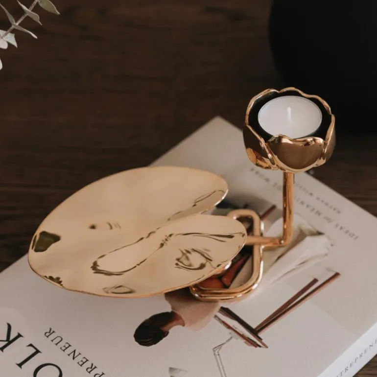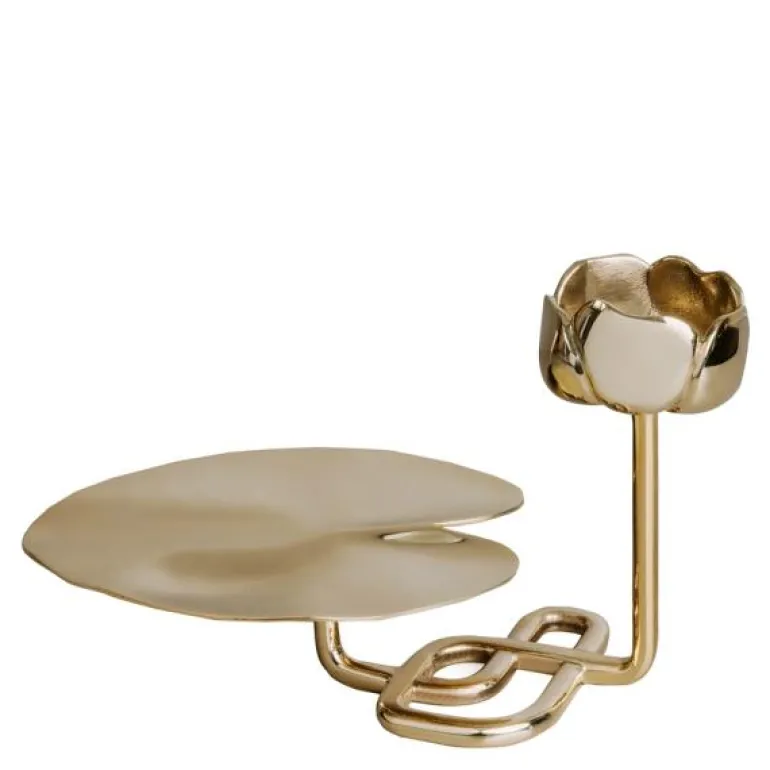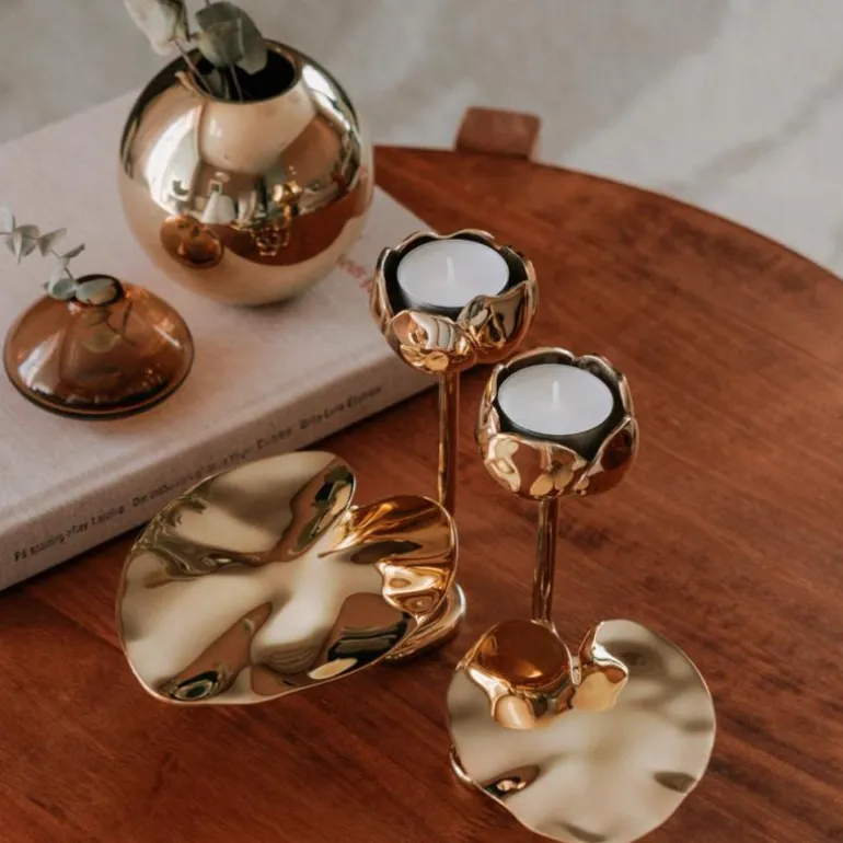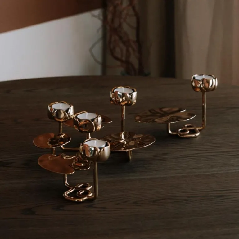 Messingen i Ninfea No.2 reflekterer lysets flamme på en vakker måte. Ninfea No.2 er vakker alene og kan bli et effektfull stilleben i gruppe med de andre størrelsene. Kommer med innsats for kronelys, og kan derfor brukes med telys eller kronelys – etter eget ønske.