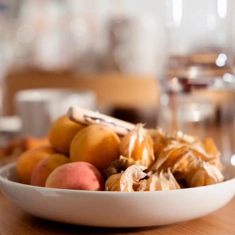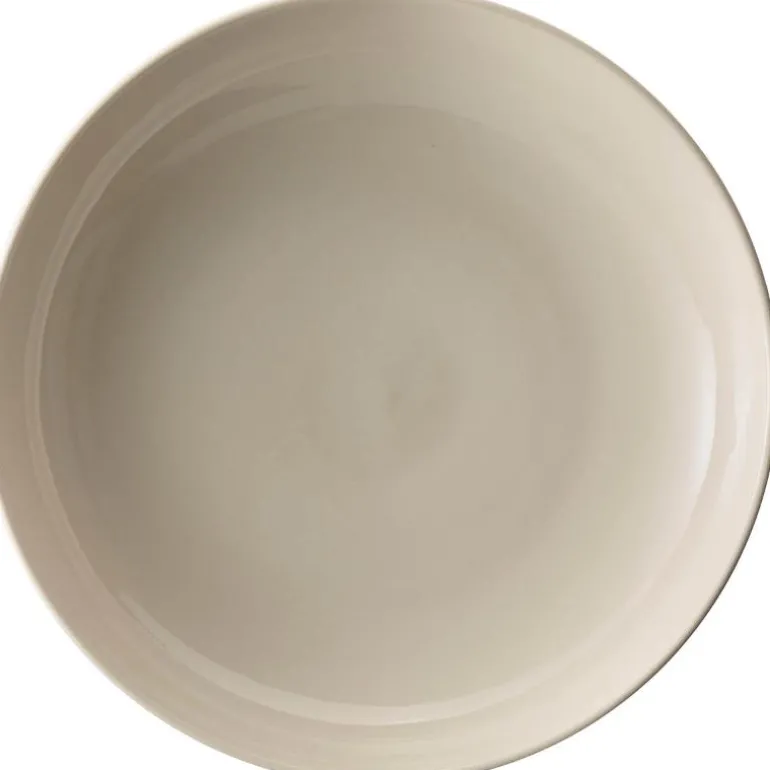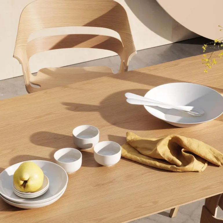 Serviset er laget av kraftig brent steingods i en myk og sandaktig fargetone uten noen synlig finish, slik at maten som serveres er eneste dekorasjon. Den matte strukturen fremhever lysspillet i flatene, og steingodset er full- eller halvglasert med et transparent uttrykk.