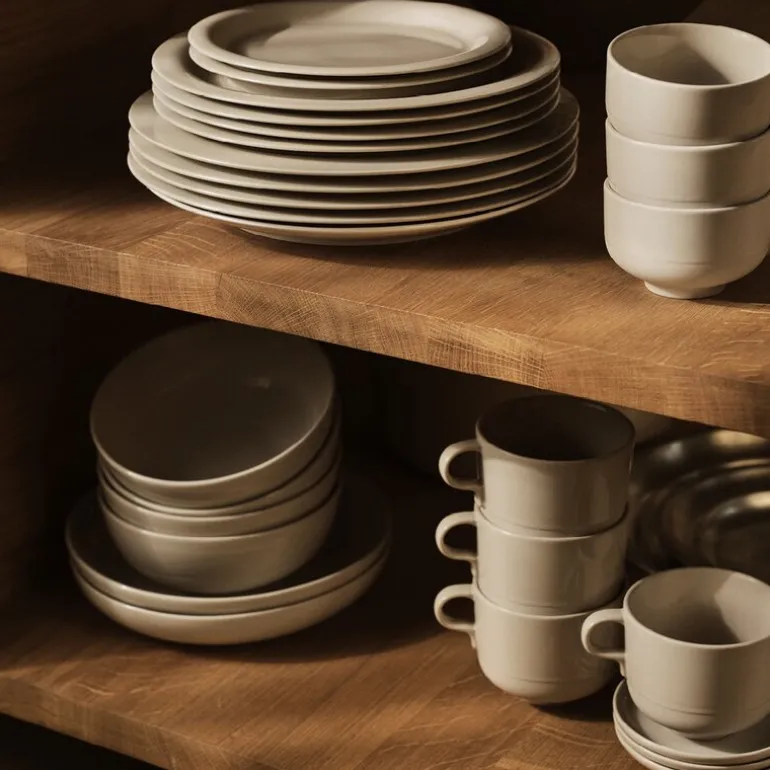 Serviset er laget av kraftig brent steingods i en myk og sandaktig fargetone uten noen synlig finish, slik at maten som serveres er eneste dekorasjon. Den matte strukturen fremhever lysspillet i flatene, og steingodset er full- eller halvglasert med et transparent uttrykk.