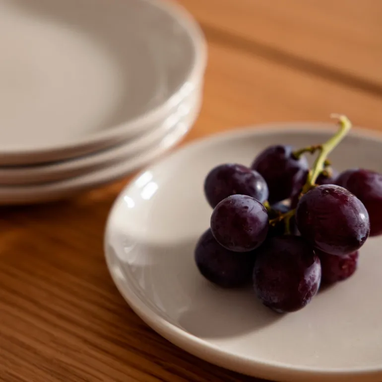 Serviset er laget av kraftig brent steingods i en myk og sandaktig fargetone uten noen synlig finish, slik at maten som serveres er eneste dekorasjon. Den matte strukturen fremhever lysspillet i flatene, og steingodset er full- eller halvglasert med et transparent uttrykk.