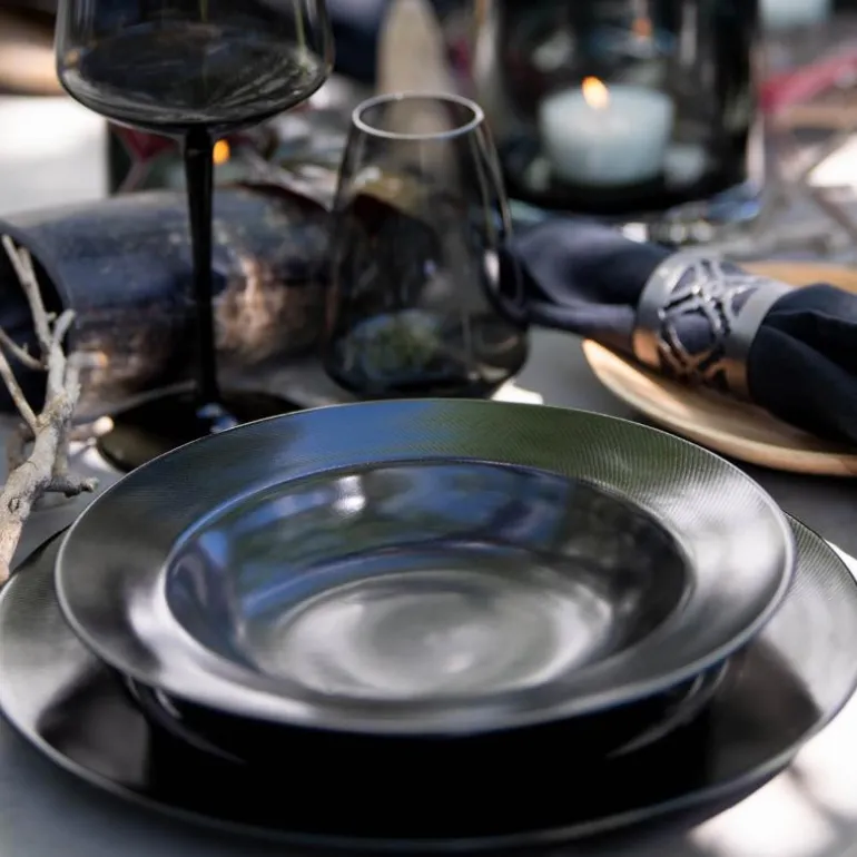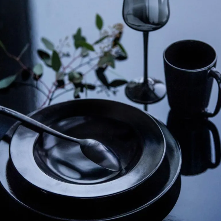 NOIR-serien omfatter sort bobleglass med en kapasitet på 36 cl, flat tallerken med en diameter på 28 cm, dyp tallerken med en diameter på 23 cm, asjett med en diameter på 22 cm og krus med en kapasitet på 30 cl. Disse delene passer perfekt for både lunsj og middag, samt for spesielle retter som krever det lille ekstra. Bobleglasset er munnblåst og håndlaget av dyktige artister, mens porselenet er av ypperste kvalitet med matt glasur, høy hvithetsgrad og styrke. NOIRs design kombinerer rå eleganse med sofistikert uttrykk. Dette serviset innbyr til trendy bordoppdekninger og minneverdige anledninger, og det vil uten tvil sette en suksessfull tone rundt bordet.