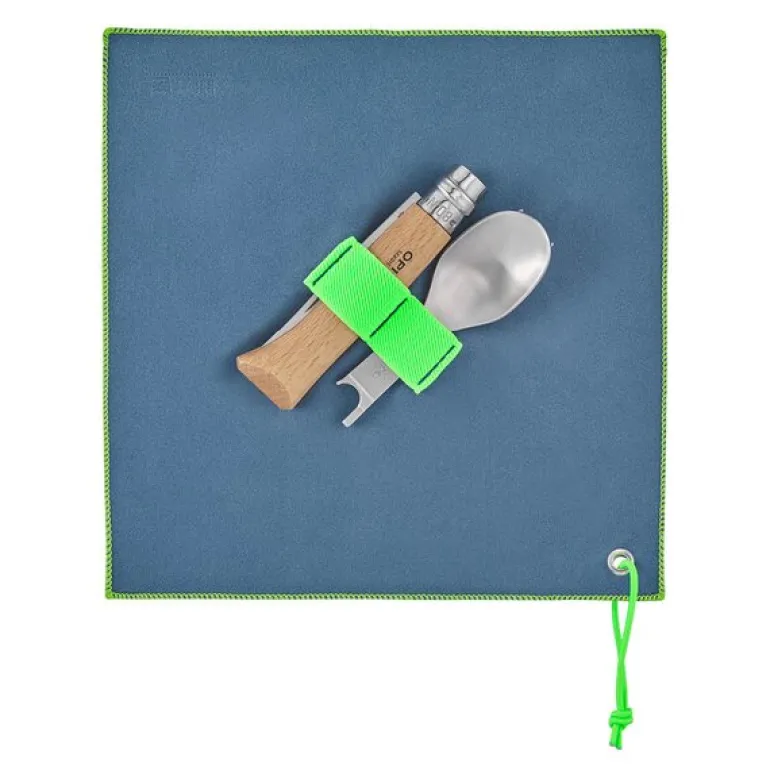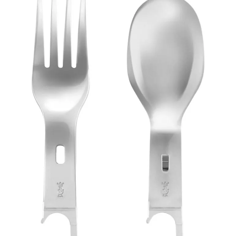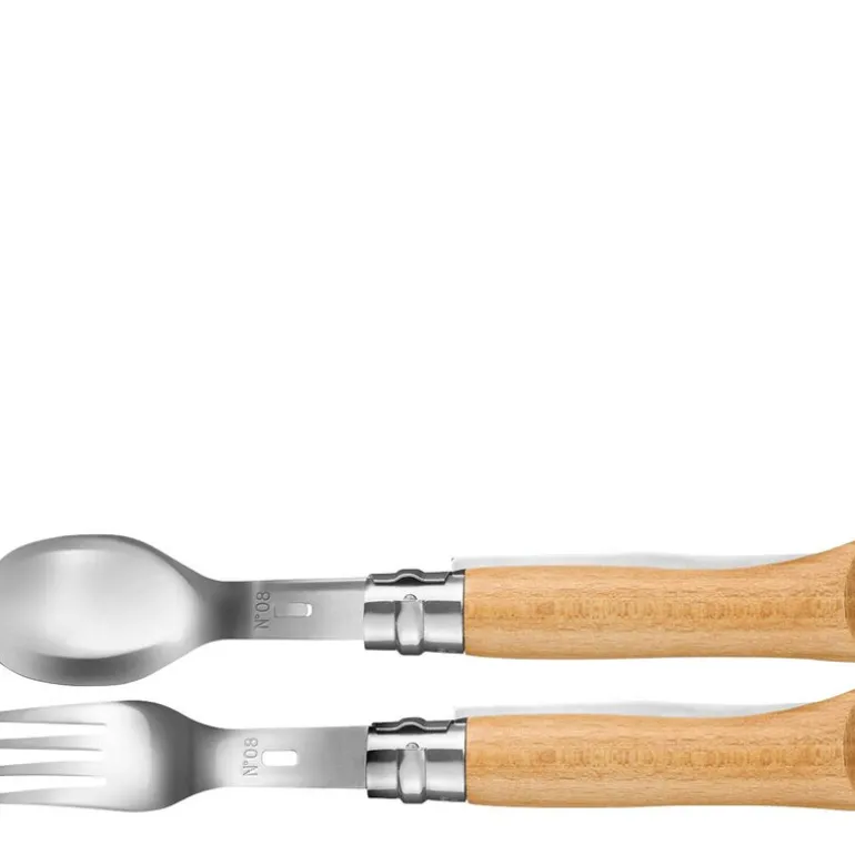 Settet består av en N°08 foldekniv, to rustfrie ståldeler – en gaffel og en skje – som enkelt festes til knivens håndtak, samt et mikrofiberetui som både beskytter og fungerer som rengjøringsklut. Alt er kompakt, slitesterkt og laget for å vare.