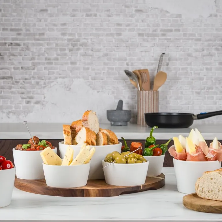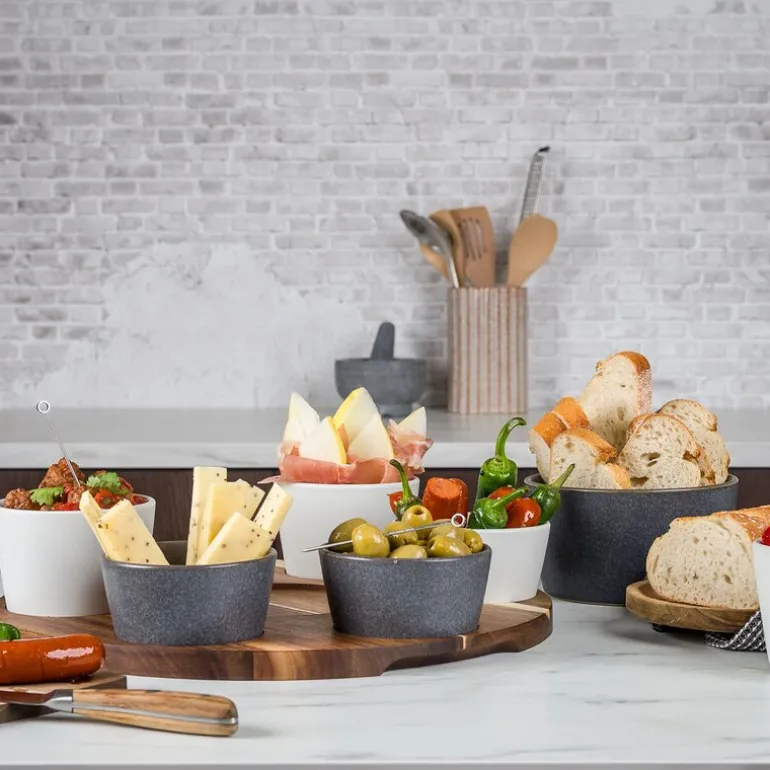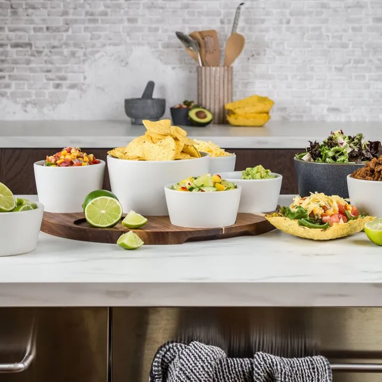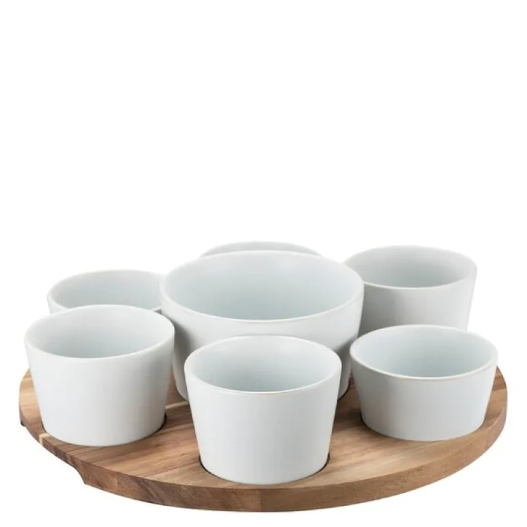 Settet består av syv skåler i ulike størrelser, perfekt tilpasset for å romme alt fra sauser, salsaer og guacamole til kjøtt, grønnsaker og annet garnityr. Hver ingrediens får sin egen plass, noe som både ser elegant ut og gjør det enkelt å servere. Skålene er laget av høykvalitets steintøy som ikke bare gir et solid og holdbart produkt, men også en vakker finish som tåler både oppvaskmaskin og temperaturer opp til 220°C.
