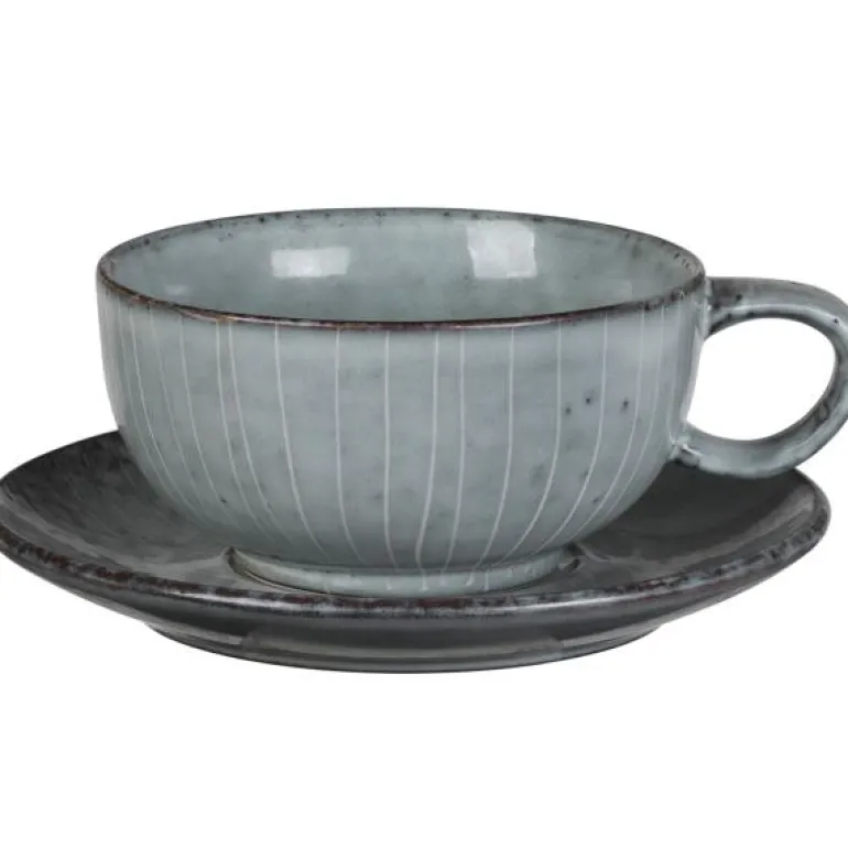 Gråblå kopp 25 cl med fat i Nordic Sea serien fra Broste Copenhagen. Bruk gjerne den fine koppen med fat alene eller sammen med de andre servisedelene i den flotte Nordic Sea serien. Den kan med fordel også brukes i en herlig avslappet miks av de andre populære serivsene fra Broste Copenhagen. Nordic Sea er den mest kjente og populære serien fra Broste Copenhagen. Fargeskalaen i serien fanger opp fargene i Nordsjøen på en stormfull dag. Det unike utseendet oppstår ved at delene har blitt glasert og deretter brent under jorden. Fordi alle delene reagerer forskjellig på denne prosessen får alle produkter unike uttrykk både når det gjelder farge og struktur. Tåler oppvaskmaskin. Tåler mikrobølgeovn.