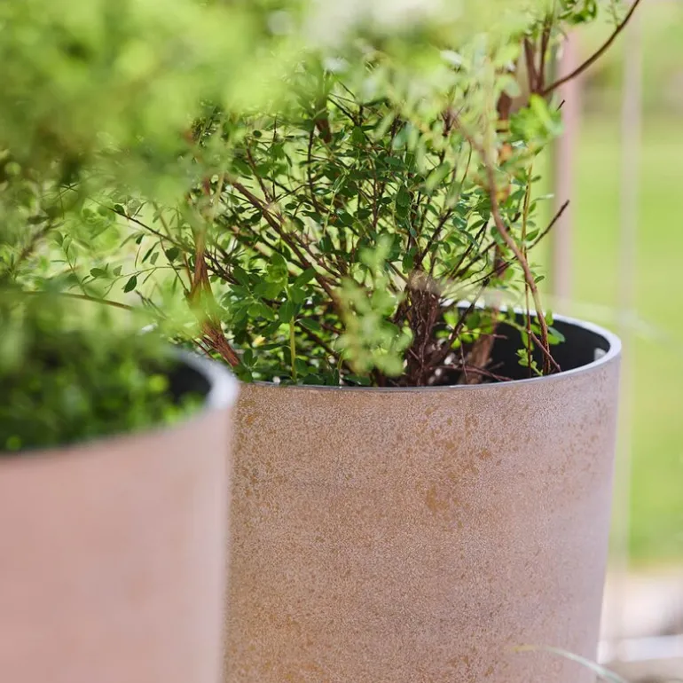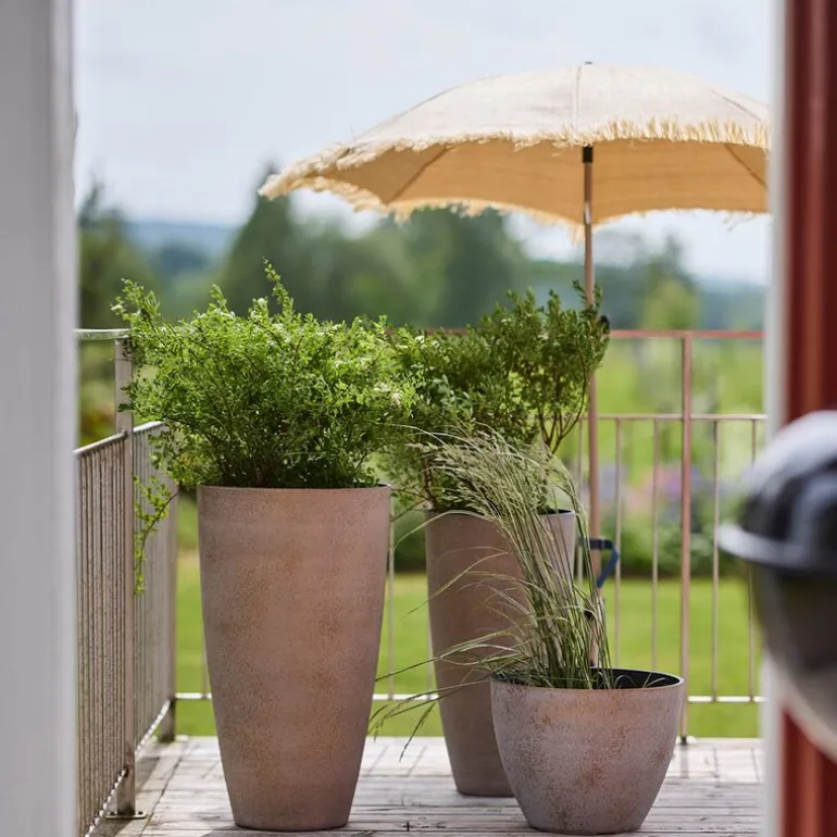 Den matte overflaten og concrete gold-fargen gir potten et elegant og industrielt preg som passer perfekt i uterom eller moderne interiører. Den er utstyrt med dreneringshull som gjør den godt egnet for utendørsbruk. Som en del av Nova-serien kombinerer denne potten tidløs design med praktiske egenskaper.