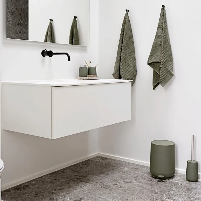 Nova toalettbørste fra Zone Denmark kombinerer funksjonalitet med et stilrent og luksuriøst uttrykk. Den olivengrønne soft-touch-overflaten gir en myk og behagelig tekstur som både føles eksklusiv og tilfører baderommet en rolig spa-stemning.