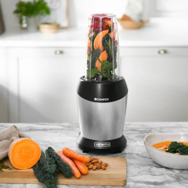 Champion Nutrition Blender er den ideelle følgesvennen for deg som ønsker en sunnere livsstil gjennom friske smoothies og juicer. Med sin kraftige motor og spesialdesignede knivblad kan du enkelt blande frukt, grønnsaker, nøtter eller is til en jevn og delikat konsistens. Blenderens beholder og lokk kan vaskes i oppvaskmaskinen, noe som gjør rengjøringen både rask og enkel. Den leveres med to beholdere på henholdsvis 500 ml og 800 ml, laget av holdbar tritanplast og de rustfrie stålknivene sikrer langvarig skarphet og effektivitet.