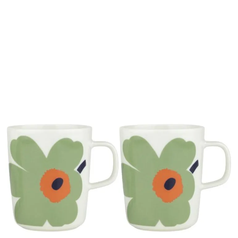 Oiva Unikko krus 25 cl 2 stk hvit/sage/oransje/mørkblå. Dette settet inkluderer to Oiva-krus som er laget av hvit steintøy som tåler oppvaskmaskin, stekeovn, mikrobølgeovn og fryser.