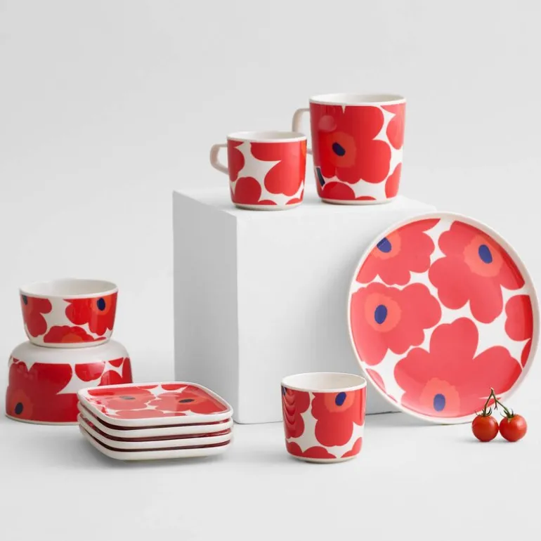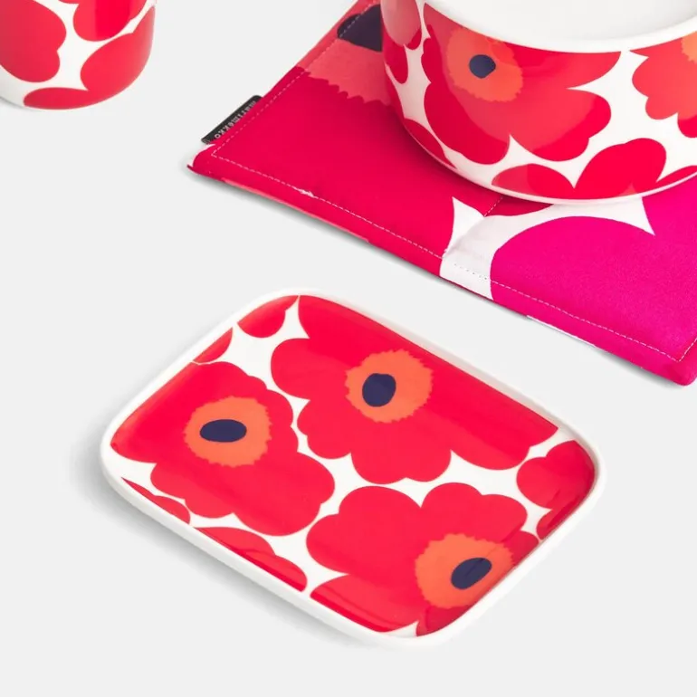 Liten rektangulær Oiva tallerken 15×12 cm i det berømte Unikko mønsteret. Skap litt glede i hverdagen med denne perfekte tallerkenen til brødskiven en travel morgen! Unikko ble laget i en tid da knapt noen blomstrete mønstre ble inkludert i Marimekkos kolleksjoner. Maija Isola var imidlertid fasinert av blomstertemaet og bestemte seg for å lage et stort utvalgt av nye blomstermønstre i 1964. Et av dem var nå ikoniske Unikko.