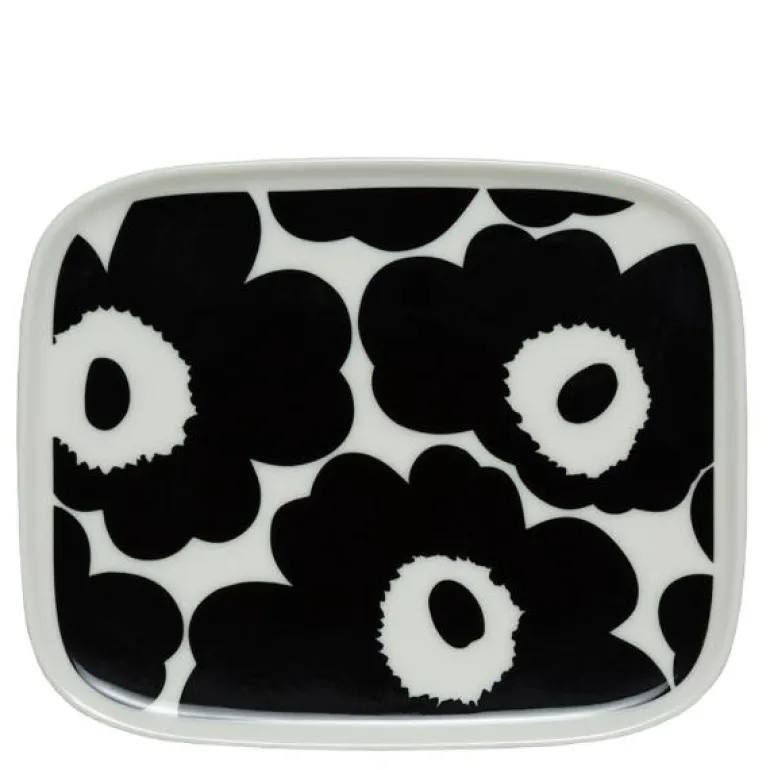 Liten rektangulær Oiva tallerken 15×12 cm i det berømte Unikko mønsteret. Skap litt glede i hverdagen med denne perfekte tallerkenen til brødskiven en travel morgen! Unikko ble laget i en tid da knapt noen blomstrete mønstre ble inkludert i Marimekkos kolleksjoner. Maija Isola var imidlertid fasinert av blomstertemaet og bestemte seg for å lage et stort utvalgt av nye blomstermønstre i 1964. Et av dem var nå ikoniske Unikko.