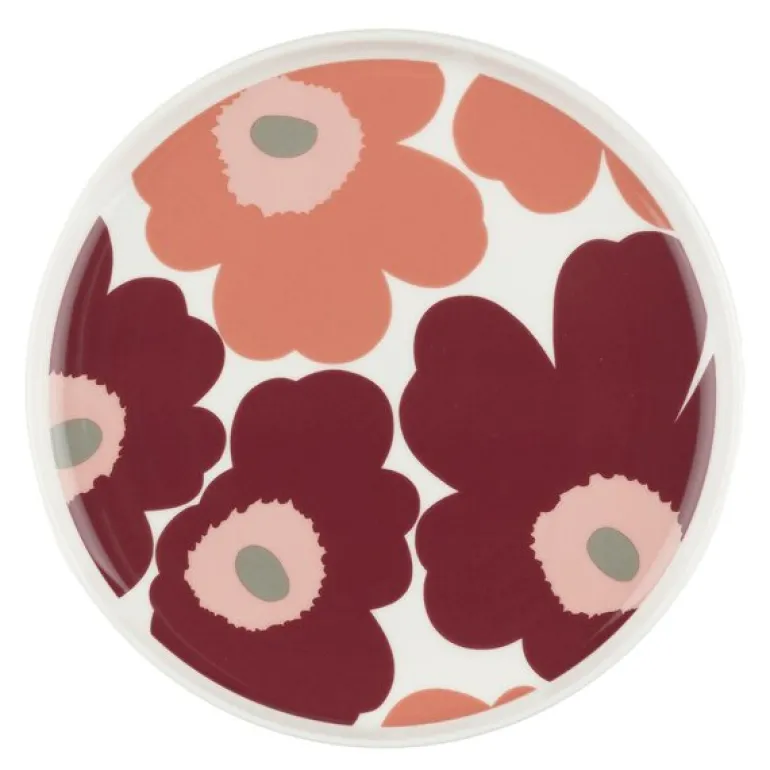 Oiva Unikko-tallerkenen på 20 cm fra Marimekko, i farger av hvit, mørk kirsebær og lakserød, er en allsidig og vakker tallerken laget av holdbart hvitt steingods. Den er både oppvaskmaskin- og ovnssikker, samt egnet for bruk i mikrobølgeovn og fryser, noe som gjør den perfekt for hverdagsbruk. Husk å fjerne klistremerket på undersiden før bruk, da det inneholder en liten mengde metall.