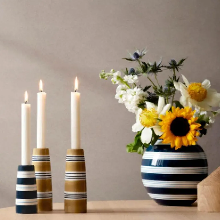 Du har kanskje allerede invitert naturen innenfor med en bukett blomster eller en potteplante som står vakkert og stilfullt plassert i en vase eller en blomsterpotte fra Omaggio Nuovo-serien? Med introduksjonen av to Omaggio Nuovo-lysestaker i to størrelser og to fargekombinasjoner gir Kähler deg nå enda flere muligheter for å kombinere kjærligheten til keramikk med kjærligheten til blomster, planter og levende lys. Den lille lysestaken på 12 cm har en mørkeblå bunnfarge og smale, lyseblå striper, mens den litt større kommer i oker og måler 16 cm. Begge står vakkert til med dybde og liv i de håndmalte stripene og glasuren, så de får «stripene i stripen» som kjennetegner Omaggio Nuovo og trekker tråder tilbake til Kählers stolte håndverkstradisjoner.